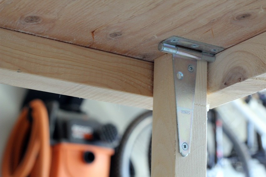 - С нижней стороны каждую деталь столешницы снабжают основой из реек по периметру. К рейкам крепят петли и ножки.