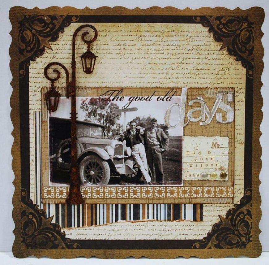 Для облегчения этой задачи можно воспользоваться скетчем, или классическим вариантом расположения элементов. С отступом от края листа в 1 см идет полоса бумаги, обрезанная фигурными ножницами. На ней с отступом от верхнего края в 3 см подряд три пуговицы. С отступом от пуговиц в 1−2 см ложится бордюрная полоса. Поверх фото. Нижний левый угол снимка декорируется цветком с полубусиной и тычинками, бабочкой из фигурного дырокола.