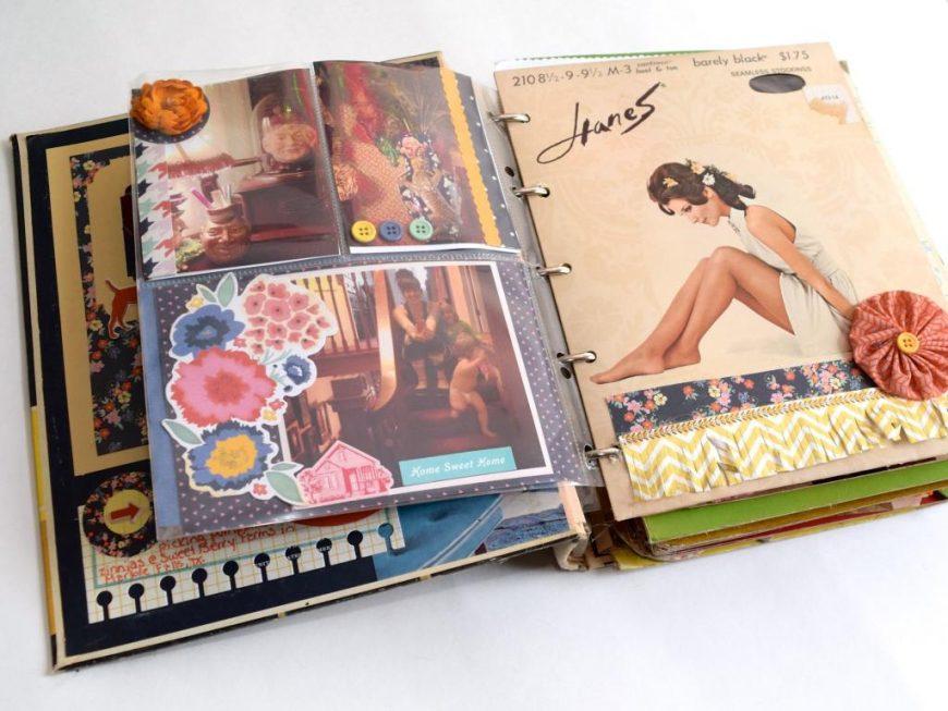 Этот вариант оформления приветствует большое количество текста на странице. Это может быть как рукописный текст, так и вырезанные из газет и журналов цитаты или описания.