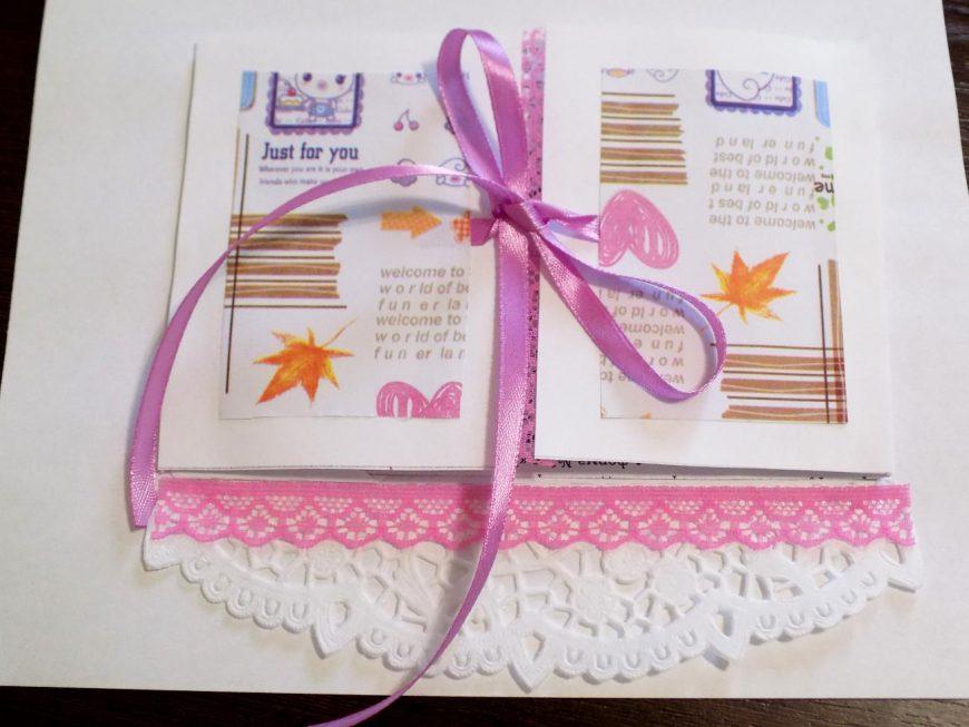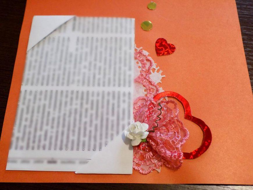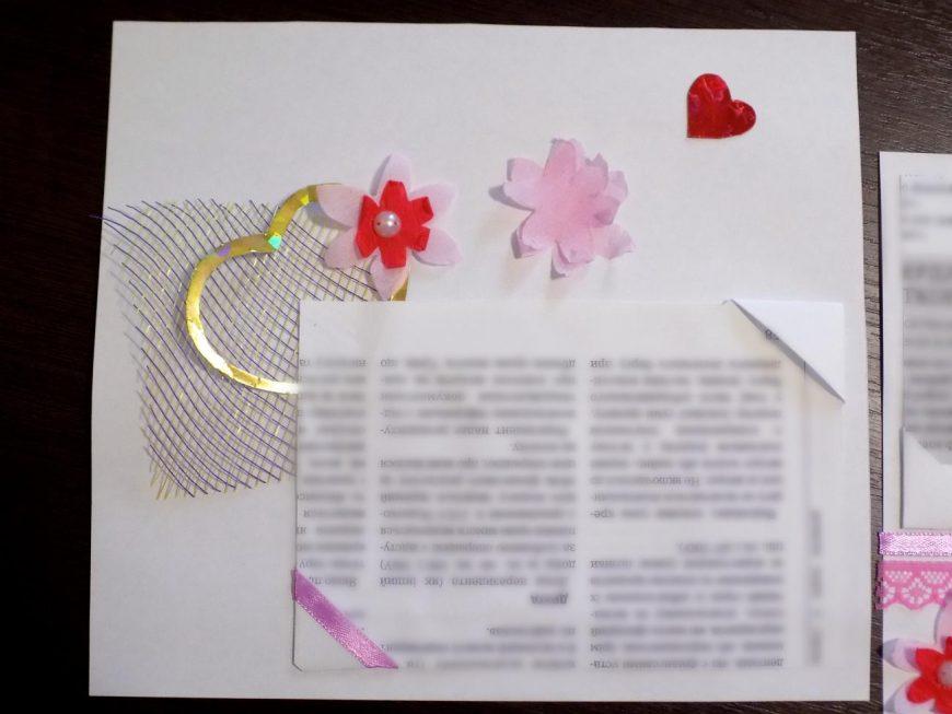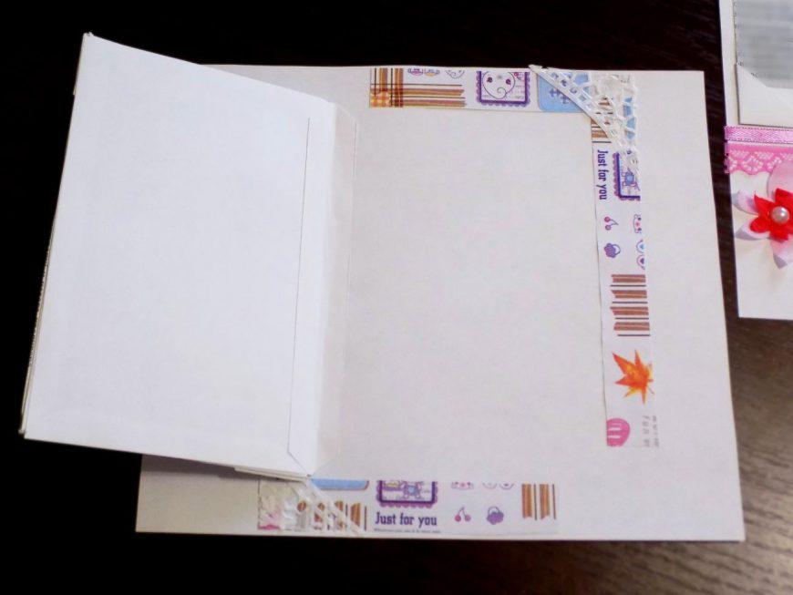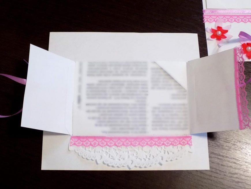 Кармашек представляет собой полосу бумаги произвольной длины и шириной 5 см, дополнительно украшенную бордюром, чипбордом, полубусинами или другими элементами. Конверт же редко украшается дополнительно, как правило, его делают из однотонной бумаги, подгоняя существующую схему под нужные размеры.