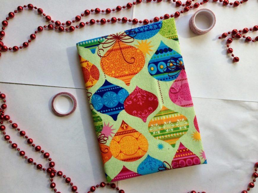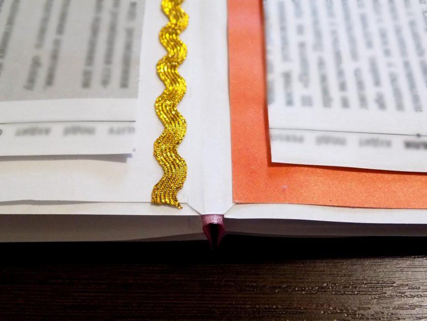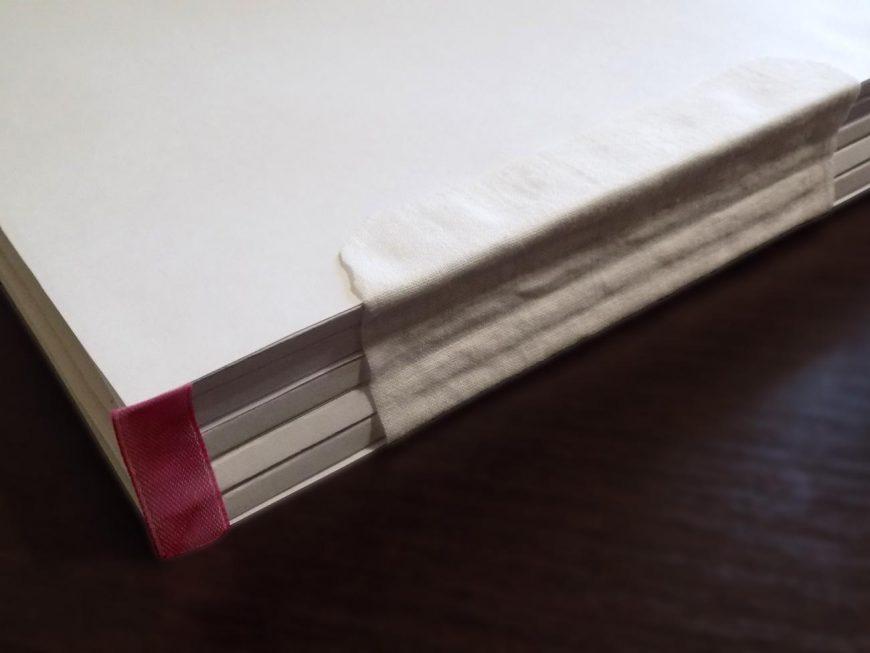 - Отрежьте 2 полосы из хлопчатобумажной ткани и приклейте их вверху и внизу переплёта.