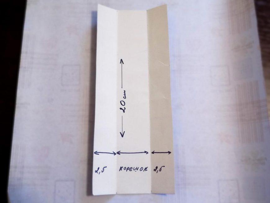 Нарежьте узкие полоски прочной бумаги для склейки листов альбома между собой. На каждой из них обозначьте посередине участок шириной 2-4 мм. Зазор такой ширины позволит использовать при декорировании объемные элементы.