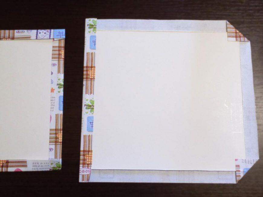 - Оклейте листы плотного картона скрап бумагой.