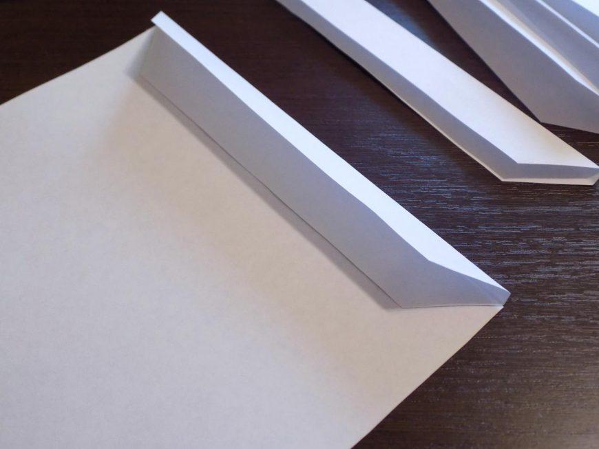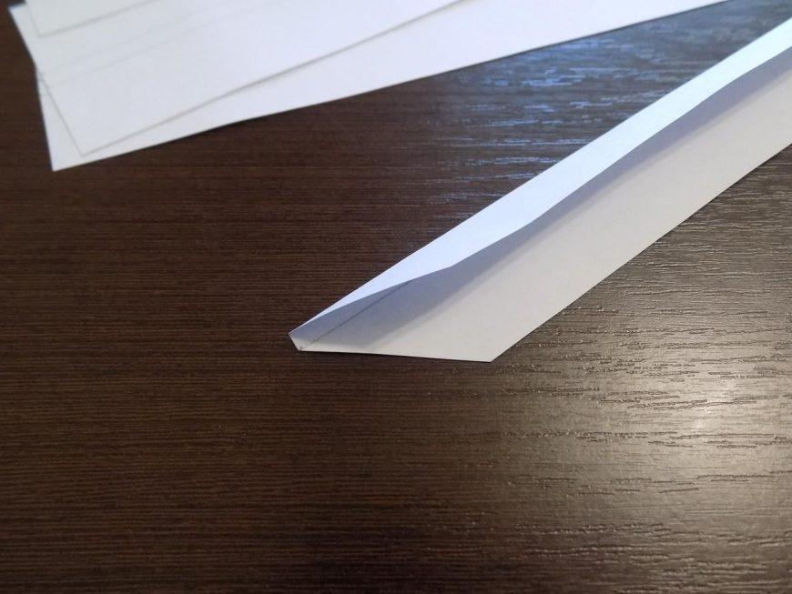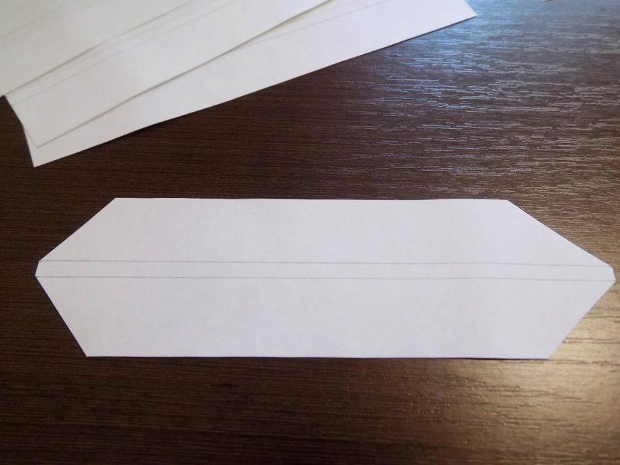 - Возьмите полосу и обозначьте центр в узкой части, используя линейку. Отложите в обе стороны по 2 мм и проведите полосы не пишущей ручкой, затем срежьте углы. Повторите этот процесс с остальными полосами.
