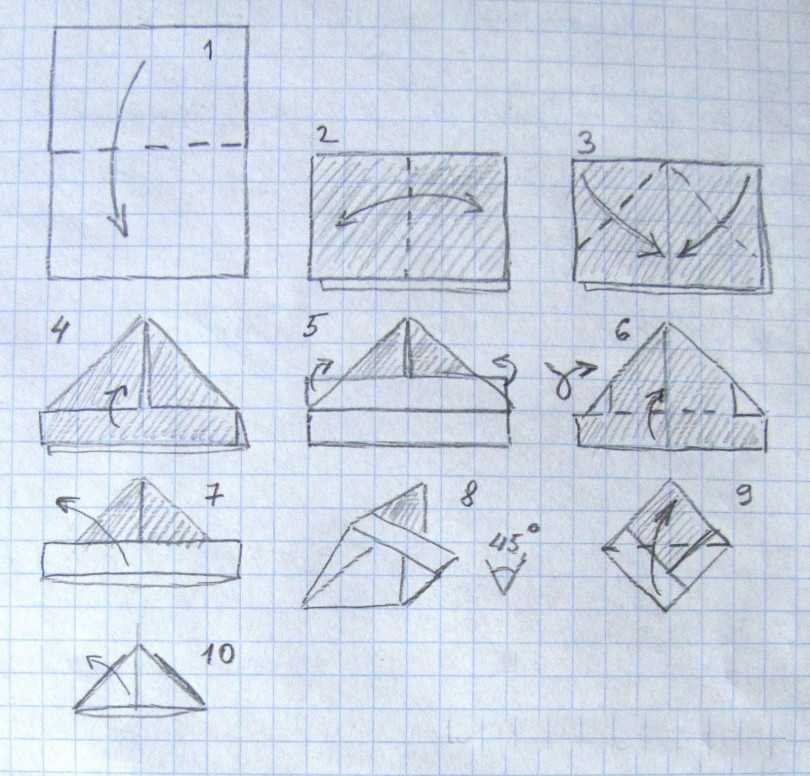 Вышеописанный вариант «кораблика» уже позволяет прикрыть голову, но все еще не решает проблемы защиты глаз от яркого солнца. Советская школа оригами и прикладного ремонта предлагает решение и для этой проблемы, а схема того, как пошагово сложить из бумаги и такой головной убор – перед вами: