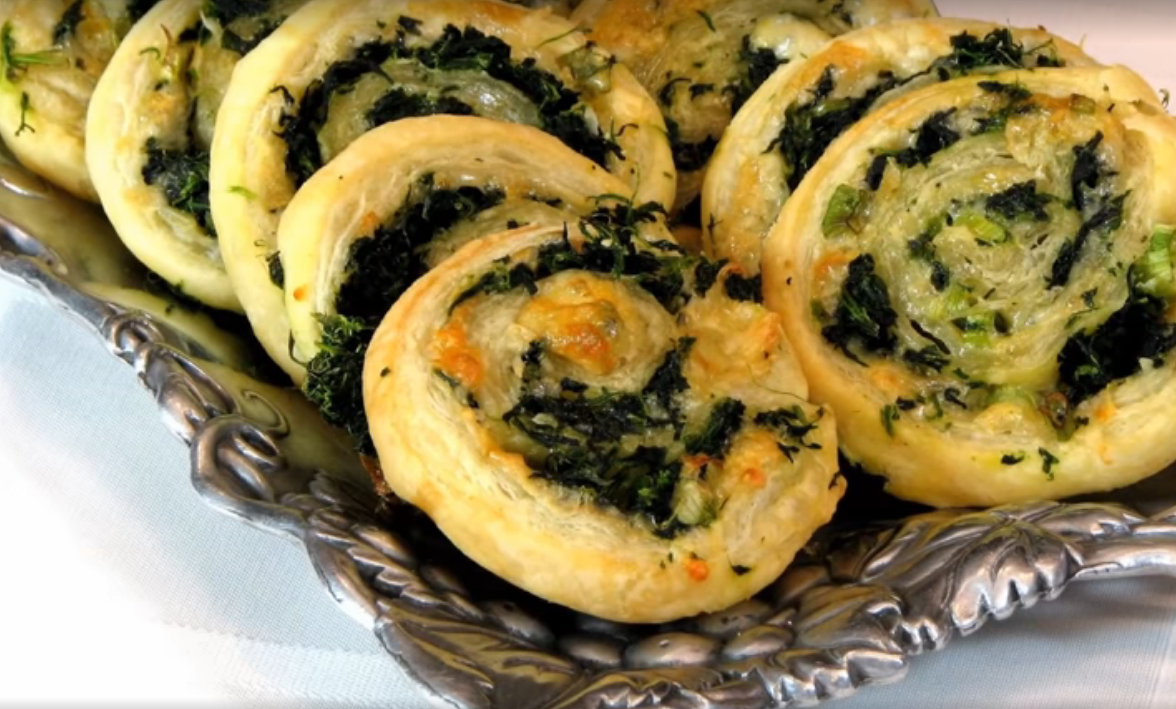 Рулетики из готового слоеного теста входят в топ самых популярных закусок. Один из любимых рецептов – со шпинатом. Эта десертная травка аппетитно смотрится в готовых блюдах. Зеленый цвет шпината не меняется на серый, как это происходит у другой пряной травы.