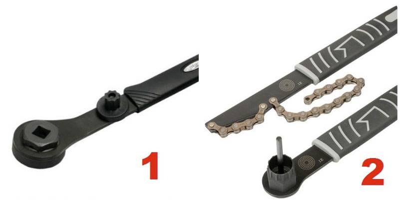 Кассетный узел устанавливается на втулку заднего колеса при помощи специального кассетного съемника с хлыстом. Здесь также понадобится максимальное усилие, хлыст помогает не проворачиваться звездам при закручивании.