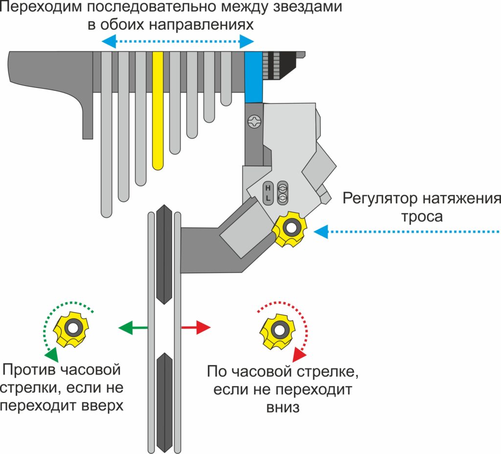 При натяжении тросика рамка вытягивается под цепью таким образом, чтобы звенья входили в другую звезду, переключая скорость. В обратном направлении велосипедист ослабляет тросик, позволяя пружине переключателя вернуть рамку в положение над соседней звездой.