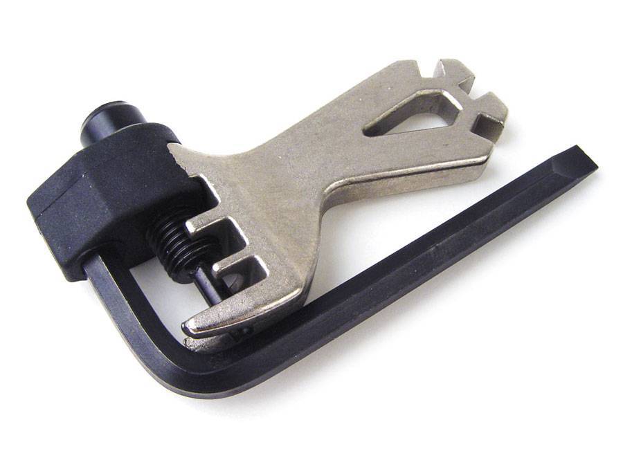 Цепной замок для разъединения звена и регулировки длины цепи. Выжимка позволяет разъединить скрепленную цепь в любом месте. Цепи, в большинстве своем, не имеют специального замочка. Если таковой есть, можно, в принципе, обойтись и без выжимки. Однако цепь может оказаться слишком длинной, а для убирания лишних звеньев без этого приспособления не обойтись.