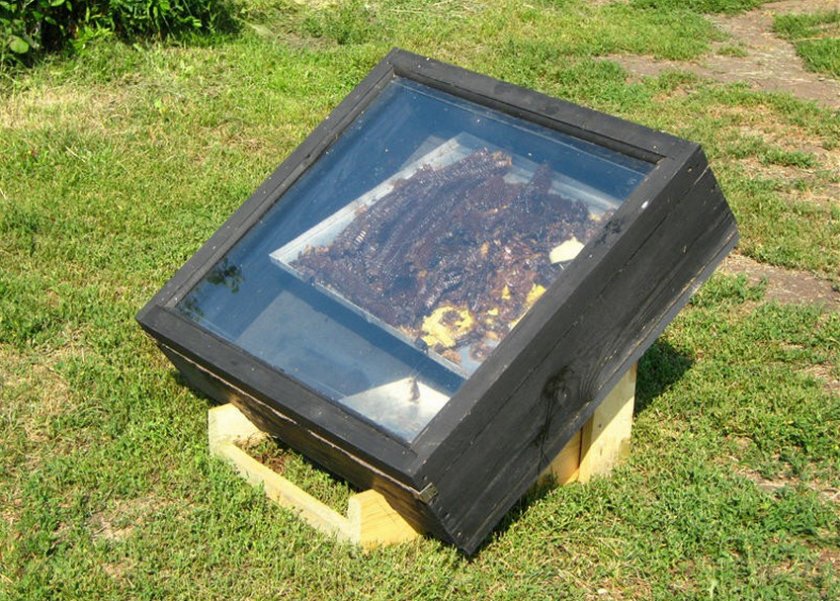 Такая воскотопка отличается простотой использования. К тому же, ее легко изготовить самостоятельно. Конструкция представляет собой ящик с наклонной стеклянной рамой. Внутри ящика располагают плоскость (противень), на которую кладут соты. Под противень устанавливают емкость, куда будет стекать расплавленный воск.