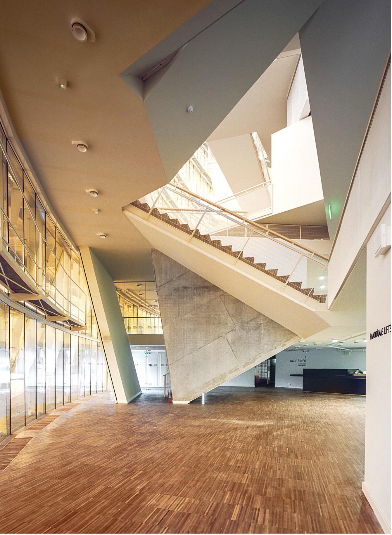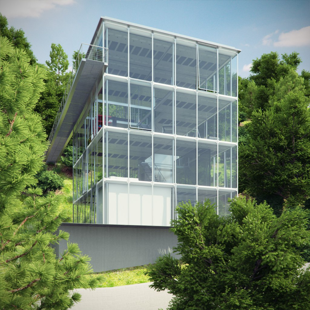 Здание представляет собой бетонную скульптуру, облицованную самонесущим чуть наклоненным стеклянным фасадом.