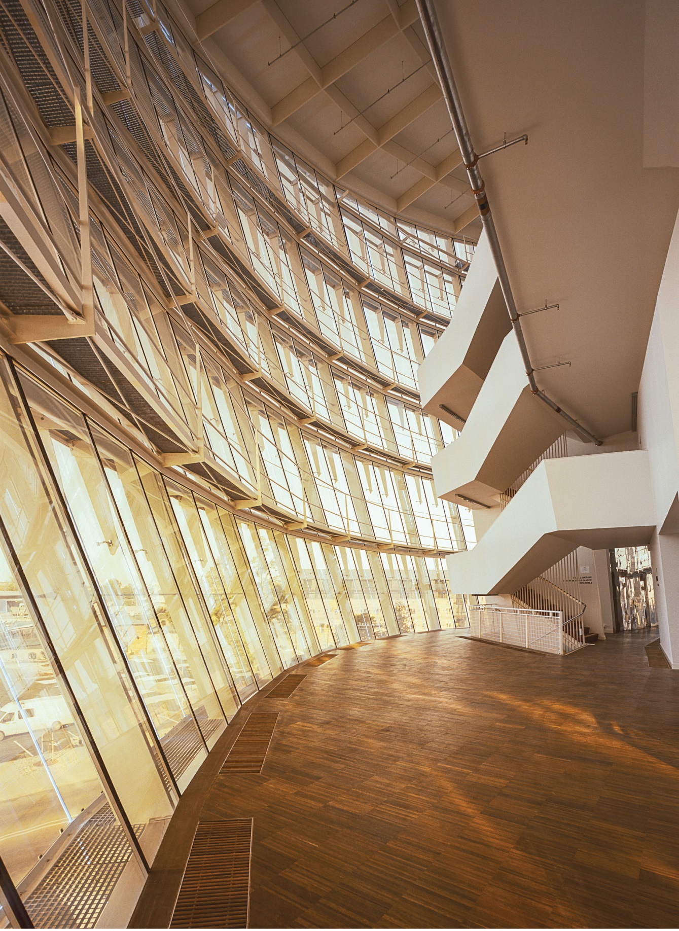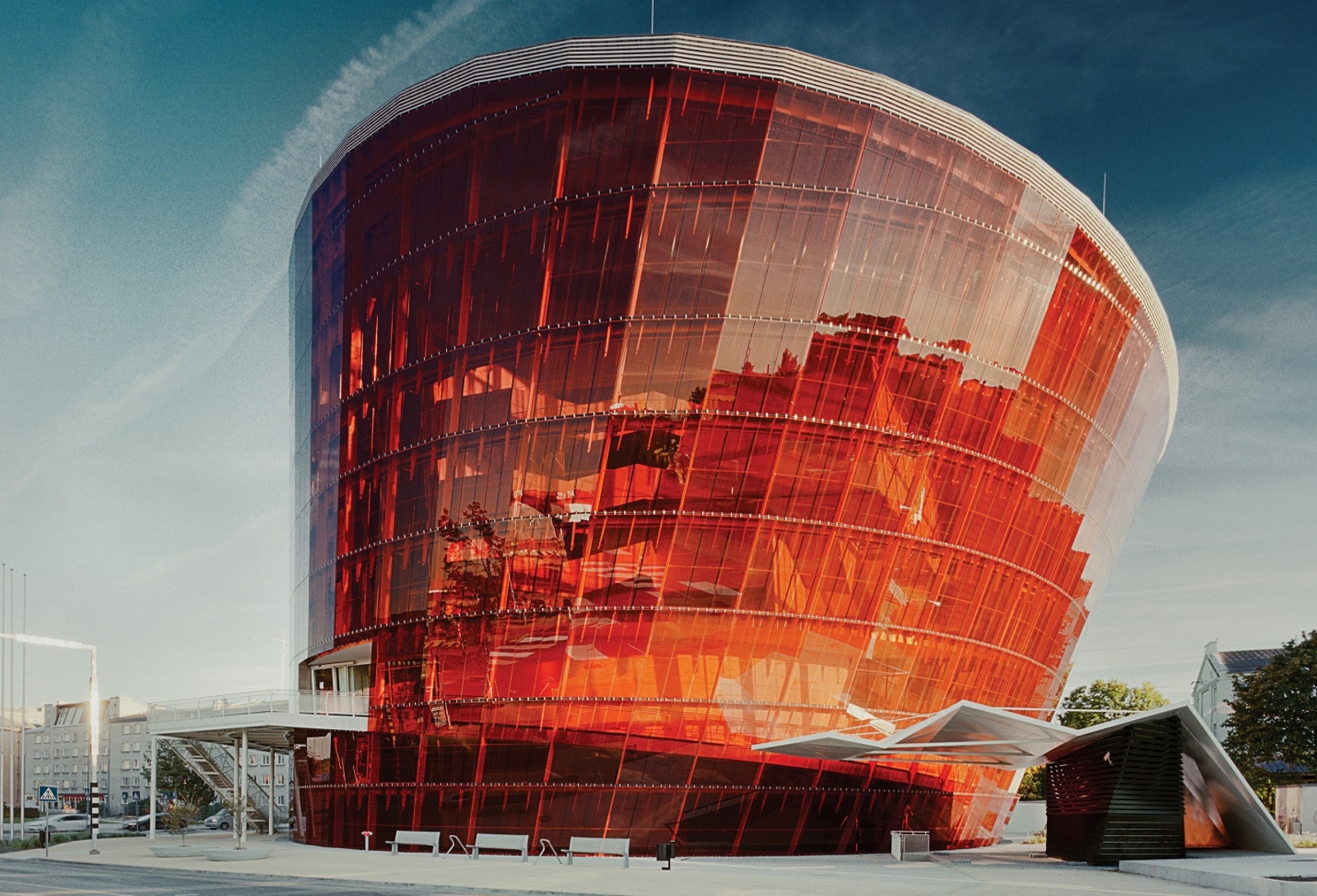 Для внешнего остекления использованы два экрана с четырьмя специальными фильмами разных цветов. В дневное время фасад светит как янтарь разных оттенков или принимает цвет неба. Ночью это огромное светящееся тело в городе, гигантский янтарь, представляющий интерьер и действо, происходящее внутри.