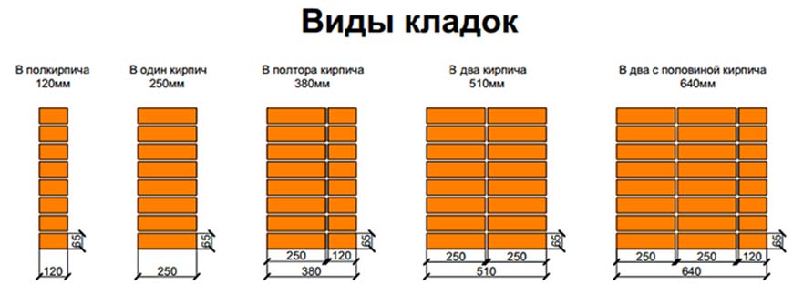 Вид кладки в первую очередь зависит от толщины стен. И это первое, с чем нужно определиться еще до начала строительства. Также отличается кладка по размерам используемого кирпича: