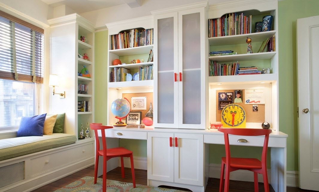 прямоугольный вытянутый стол вдоль стены также подойдет для школьников, только если они не будут теснить друг друга. Хорошо, если между двумя половинами будет перегородка в виде ящичков снизу, полочек или надстроенного стеллажа.