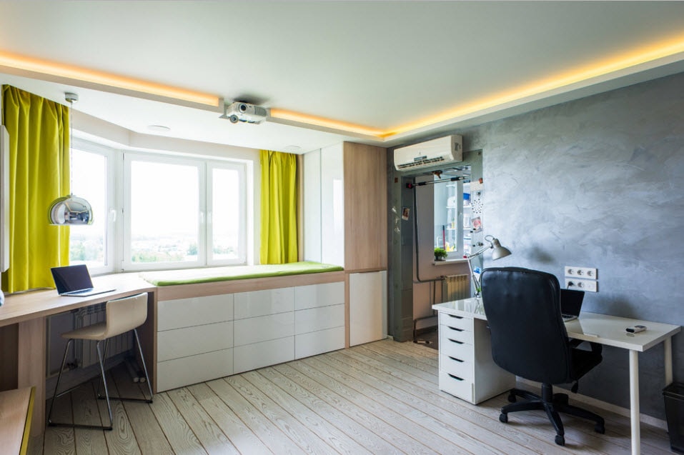 - столешница, зонирующая детскую от окна на две части. Такое решение подойдет для просторной комнаты. Оптимальная ширина конструкции, при которой дети будут чувствовать себя свободно – 1,6 м.