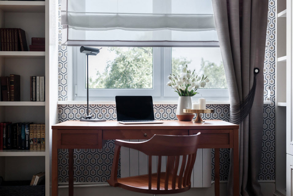 На заметку: если столешница находится на одном уровне с широким подоконником, расположите стол к нему впритык. На подоконнике можно расположить книги или подставки с канцелярией.