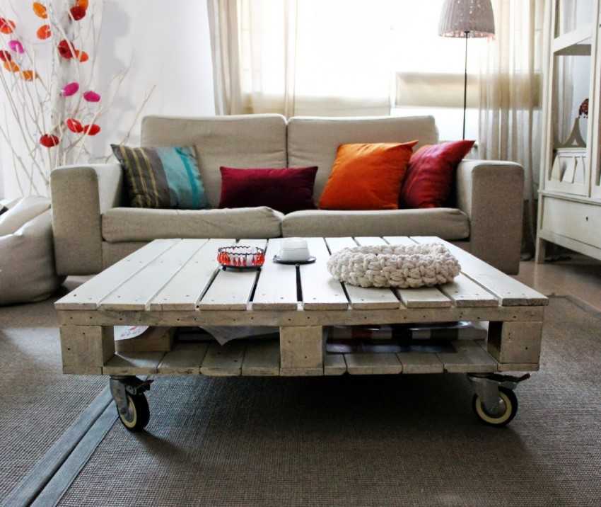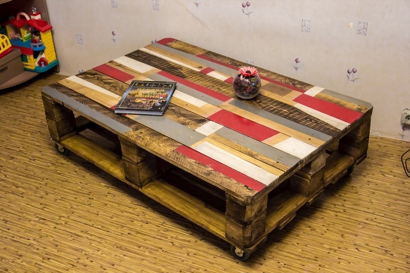 Порой однотонный столик из поддонов выглядит в интерьере слишком скучно и обыденно. Освежить дизайн помогут различные виды декоративной отделки: