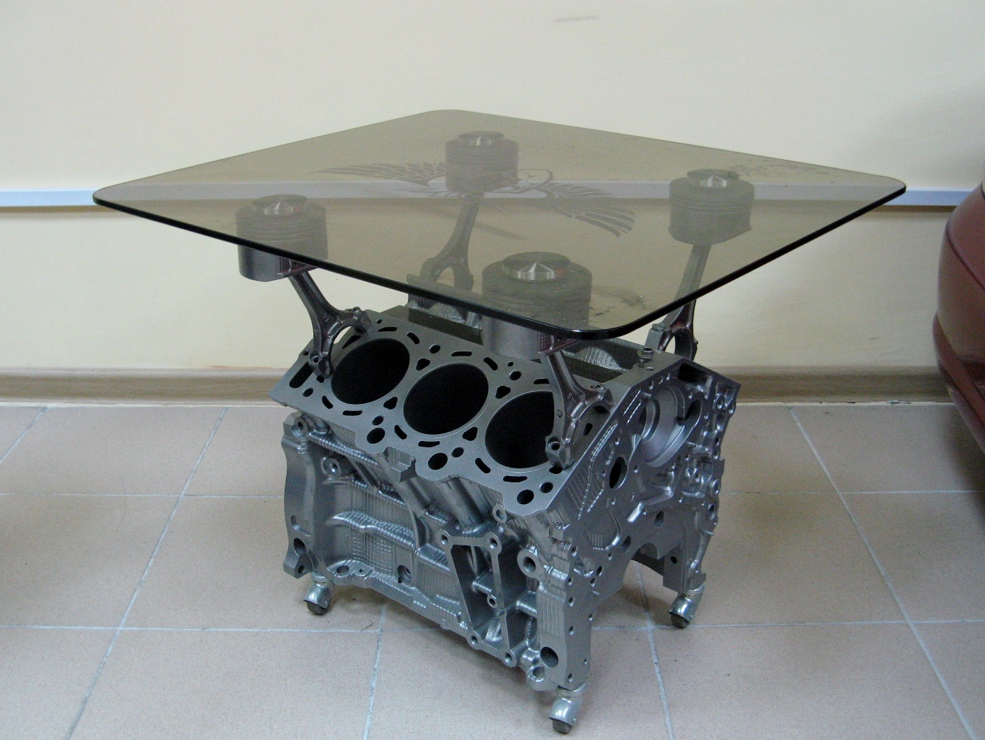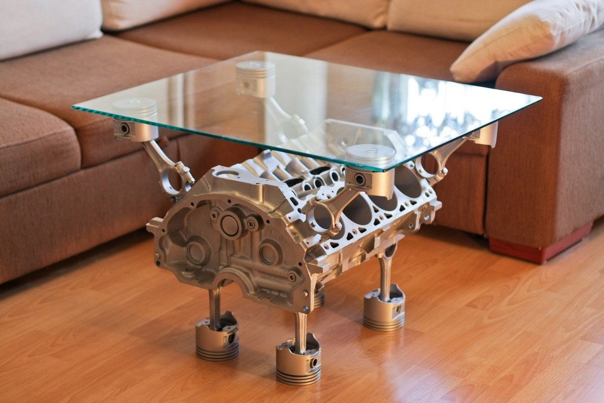 Из старого автомобильного двигателя может получиться оригинальный журнальный, барный, туалетный столик. Лучше всего для этого подходит V-образный мотор с 6–8 цилиндровым блоком. Он будет устойчивым и высоким.