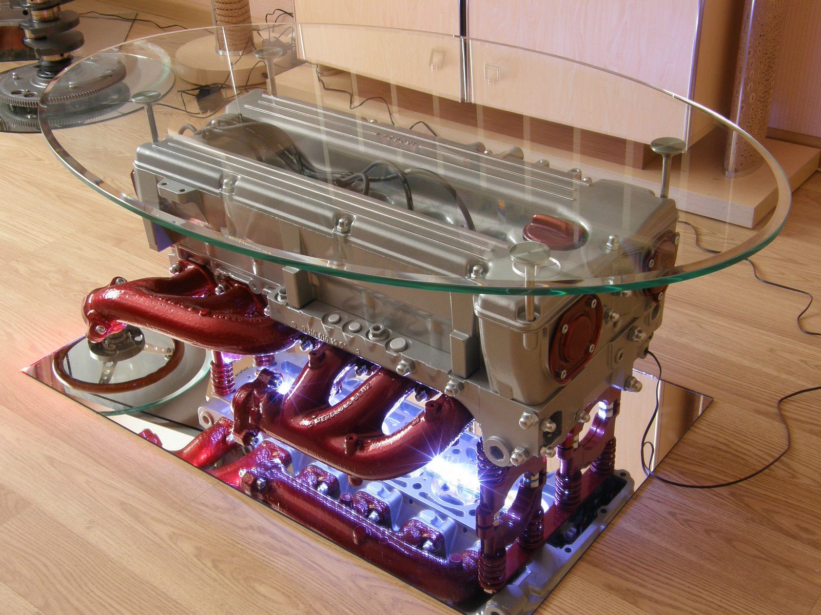 Можно былобы заморочится и запилить на ардуино более интересную подсветку, эмитирующую работу ДВС. То есть поочередное затухание-загорание поршневых отверстий. И советовал бы все таки прикрутить стекло. Неровен час коленкой заденет и заново покупать стекло или еще хуже менять напольное покрытие.