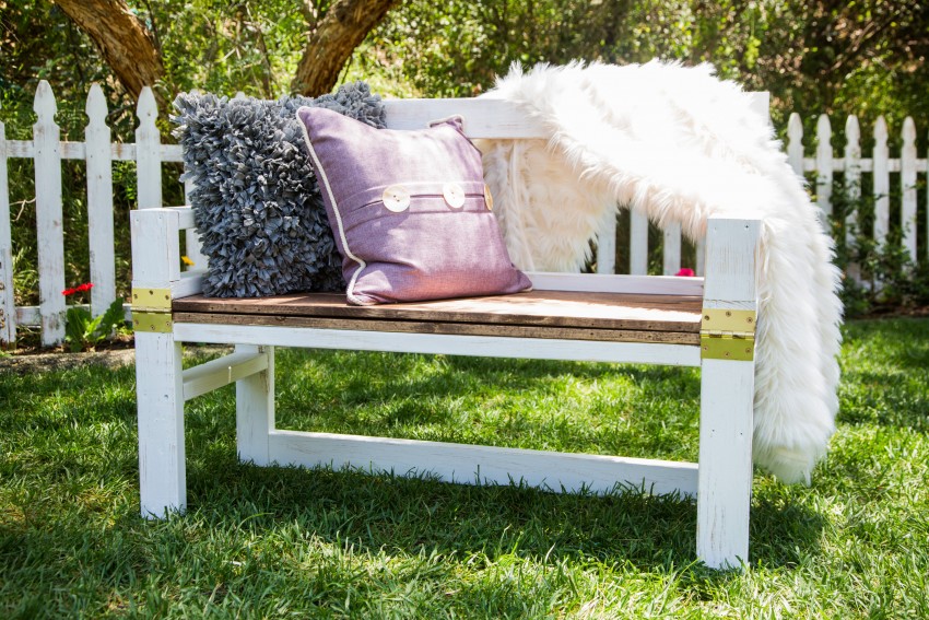 Ножки мебели изготавливают из двух тесин размером в 37х11 см и двух тесин – 34х11 см. Полученные элементы соединяются между собой металлическими пластинами и саморезами. Высота ножек должна равняться 45 см, а ширина – 37 см. Тесины для сиденья прикручивают к ножкам с помощью саморезов. Предварительно подготавливаются отверстия. Полученная конструкция снизу укрепляется распорками.