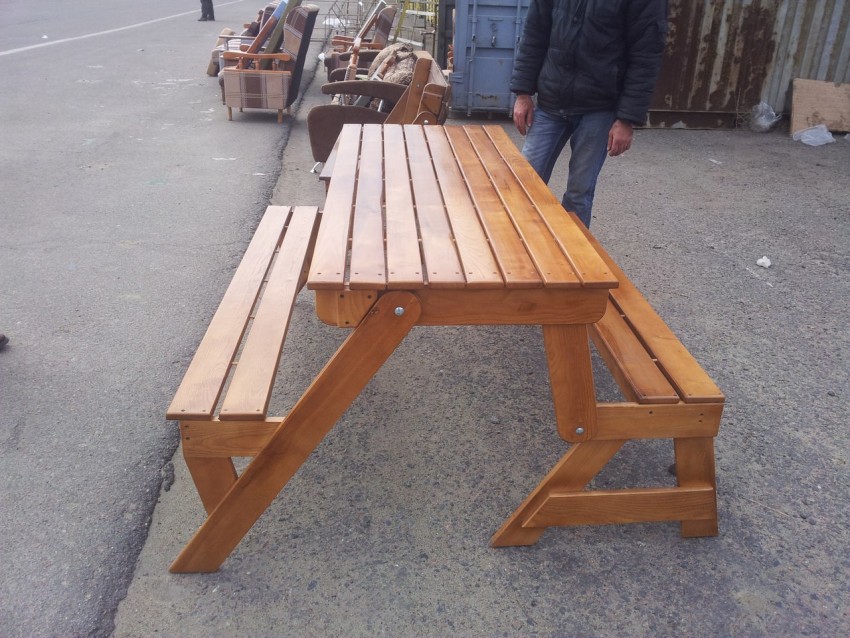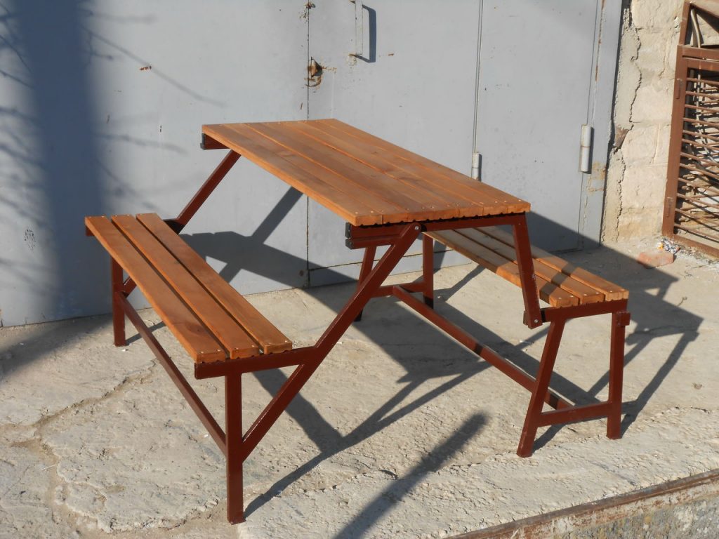 Конструкция стола состоит из трех основных элементов — непосредственно столешницы, икс — образных ножек, а также парных скамеек, соединенных снизу перекладинами.