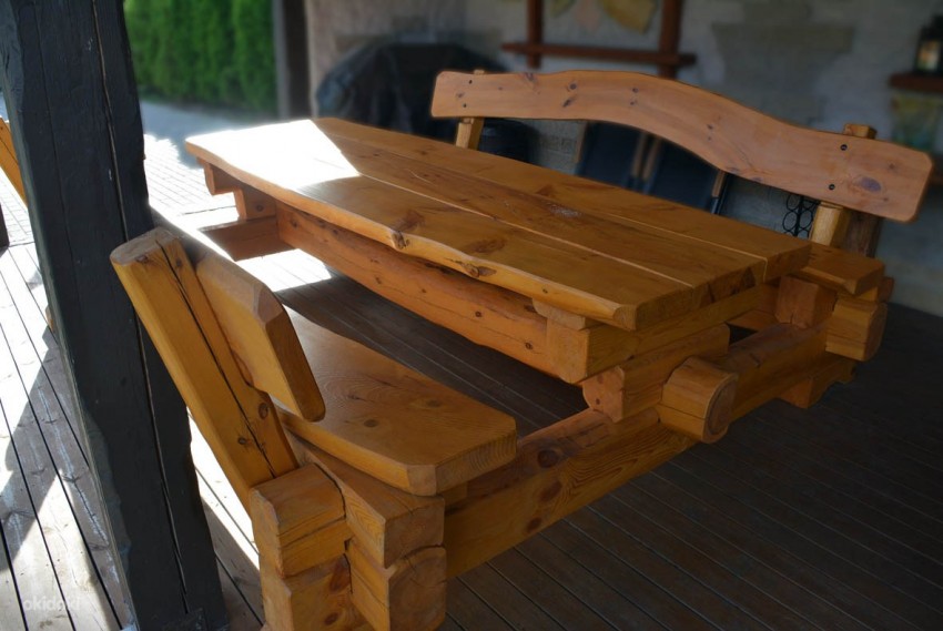 Сиденье и спинка должна быть изготовлена из дерева для большего удобства. Рекомендуется выбрать ель, так как она не портится под воздействием перепадов температуры, не поддается разрушению под действием грибков.