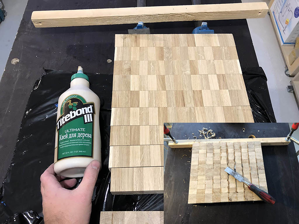 Чтобы собрать поверхность стола, в брусьях необходимо высверлить отверстия, в крайних сделать зенковку для гаек и шайб. Далее грани, которые будут совмещаться, промазываются клеем, стягиваются шпильками. Потом столешницу нужно уложить на ровную поверхность вверх дном, сделать разметку для креплений ножек.