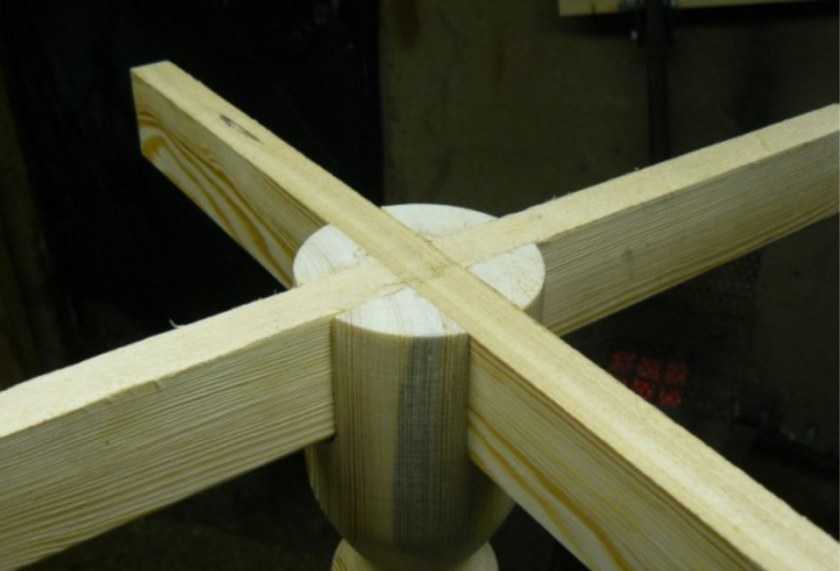 Сначала нужно сделать широкие опоры из брусьев, используя для соединения клей (на время высыхания конструкция скрепляется струбцынами). Потом вырезается отверстие квадратной формы, в нее будут установлены перемычки. Их длина больше расстояния между опорами, меньше длины плоскости стола. Перемычки должны войти в опоры, на 8 см выступая за пределы. Замком служат клинья, установленные в специальные отверстия.