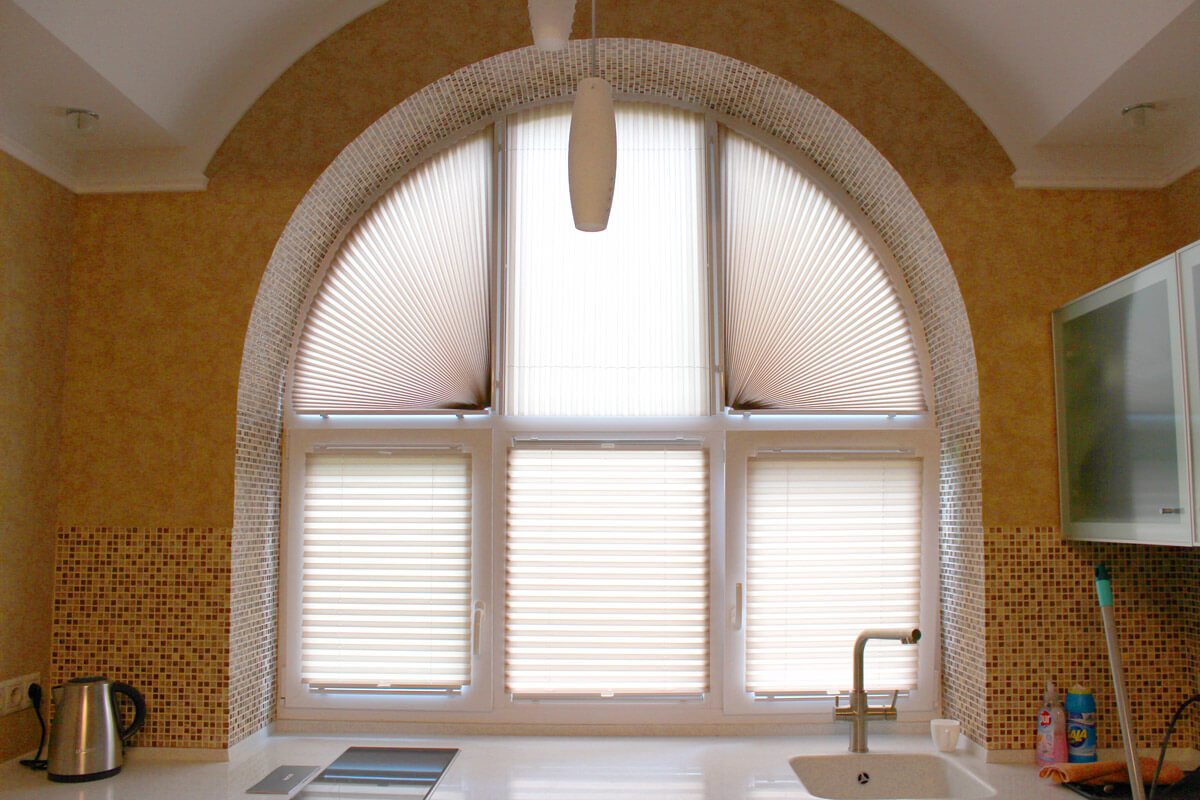 - Шторы-плиссе для круглых и арочных окон – обычно такой тип штор имеет форму веера, что не только смотрится необычно и красиво, но и играет важную роль защитника от света.