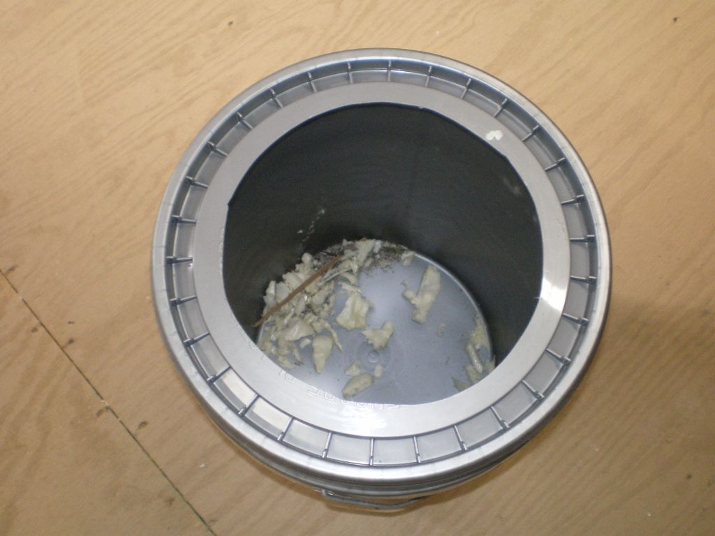 …и крупный мусор влетает в нижнее ведро. Маленький мусор поступает в фильтр. Самодельный строительный пылесос работает!