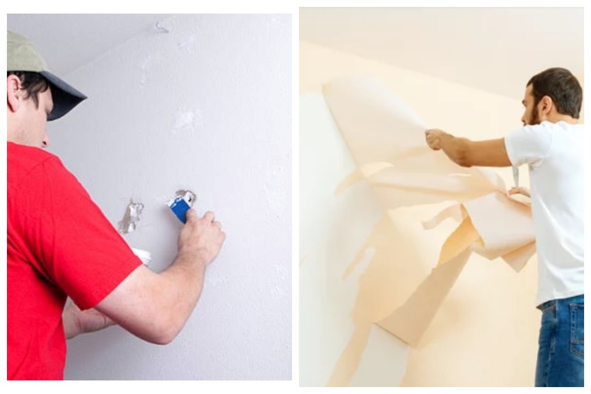 - Стены очищают от старого покрытия. Побелку размывают водой, обои и краску размачивают, а затем снимают шпателем, плитку и клей сдирают.