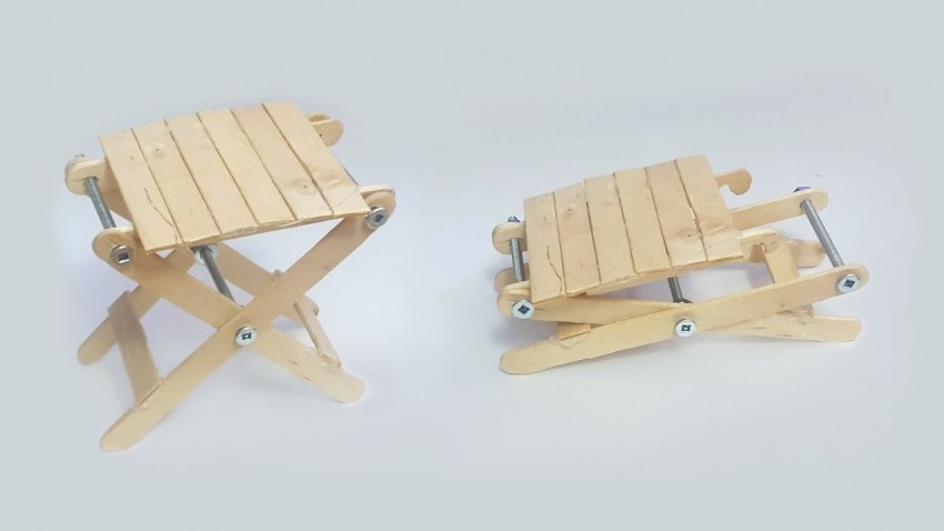 Теперь мы имеем два элемента, которые работают как шарниры. Переходим к монтажу сидения. Начнем с широких брусочков. Свес будет 15-20мм.
