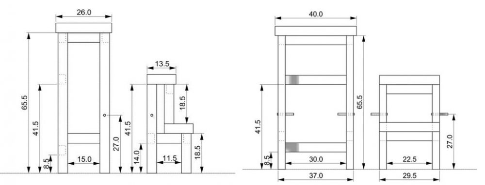 Стулы трансформеры могут состоять из 3 ступеней, а если изделие будет иметь сложенный вид, то оно будет похожим на обычный стул. Сначала нужно нарисовать чертежный образец для заготовок. Потом подготовить такие элементы: