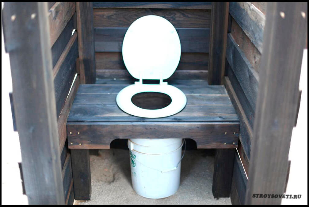 Это простейший тип туалета – нечистоты собираются в небольшое ведро (15-20 литров), установленное под стульчаком. В магазинах можно купить специальную ёмкость с предусмотренным сиденьем. После посещения туалета отходы засыпаются золой или опилками (также можно использовать торф). В помещении неплохо бы установить ящик с этими сыпучими материалами.