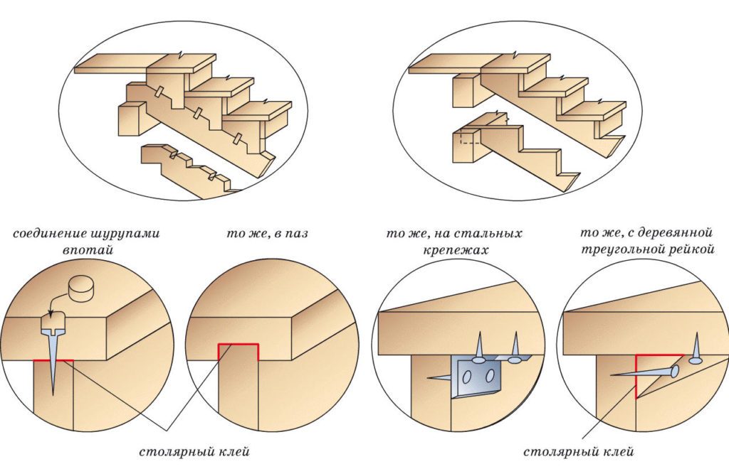 В данной конструкции они крепятся на направляющих опорах, называемых косоурами, сверху, в специально выпиленных углублениях. Крепление осуществляется с помощью саморезов. Для более прочного соединения можно использовать также клей.