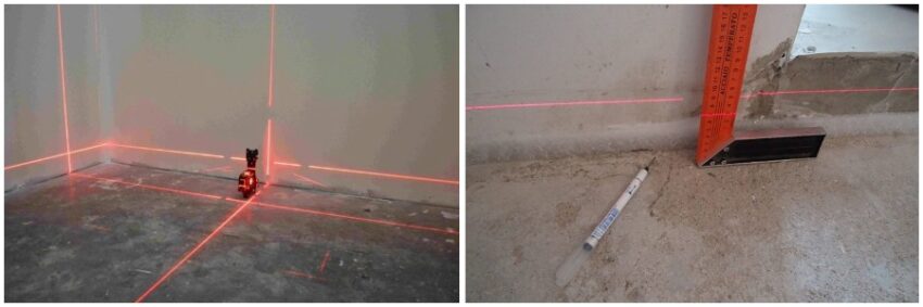 Отметку уровня пола с помощью лазерного или гидравлического нивелира выносят на стены и перегородки. К ней привязывают высоту всех слоев конструкции.