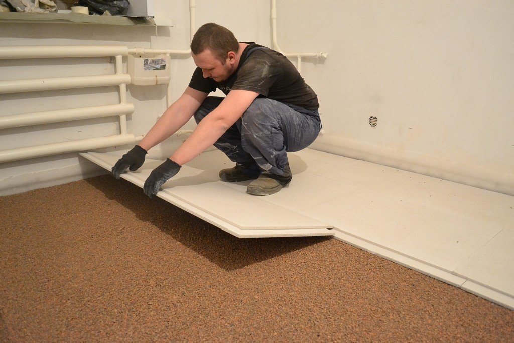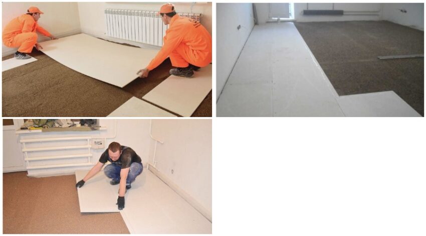 Далее на поверхность сыпучего слоя укладывается плотный и достаточно твердый материал, который и будет играть роль чернового основания для укладки напольного покрытия. Это могут быть плиты ДСП, листы фанеры, гипсокартон или гипсоволоконные плиты и т. д. Они достаточно легкие, но при этом не будут проминаться под ногами передвигающегося по ним человека или ножками стоящей на них мебели.