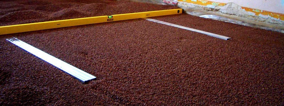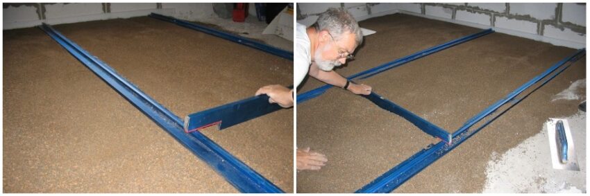 Гранулы рассыпают по поверхности на требуемую толщину. При помощи двух направляющих реек и правила проводят нивелирование, начиная с дальней от двери стены: