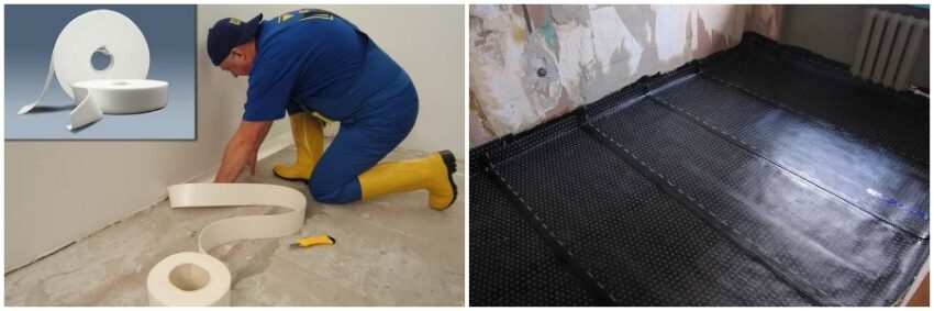 Полиэтиленовую пленку расстилают на пол с нахлестом на стены не менее 200 мм. Если пароизоляция состоит из нескольких полотнищ, их склеивают между собой двусторонним скотчем. Демпферную ленту прокладывают вдоль стен в местах, где сборная стяжка примыкает к конструкциям. В углах ее рекомендуется разрезать.