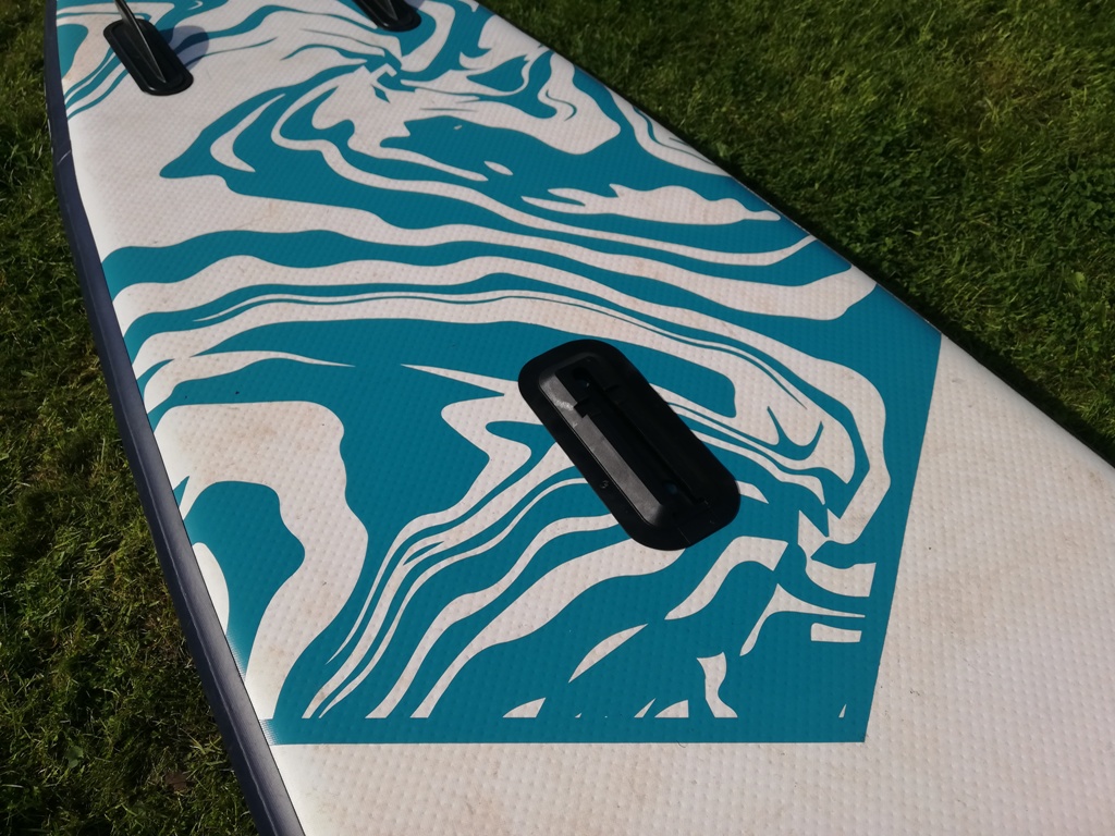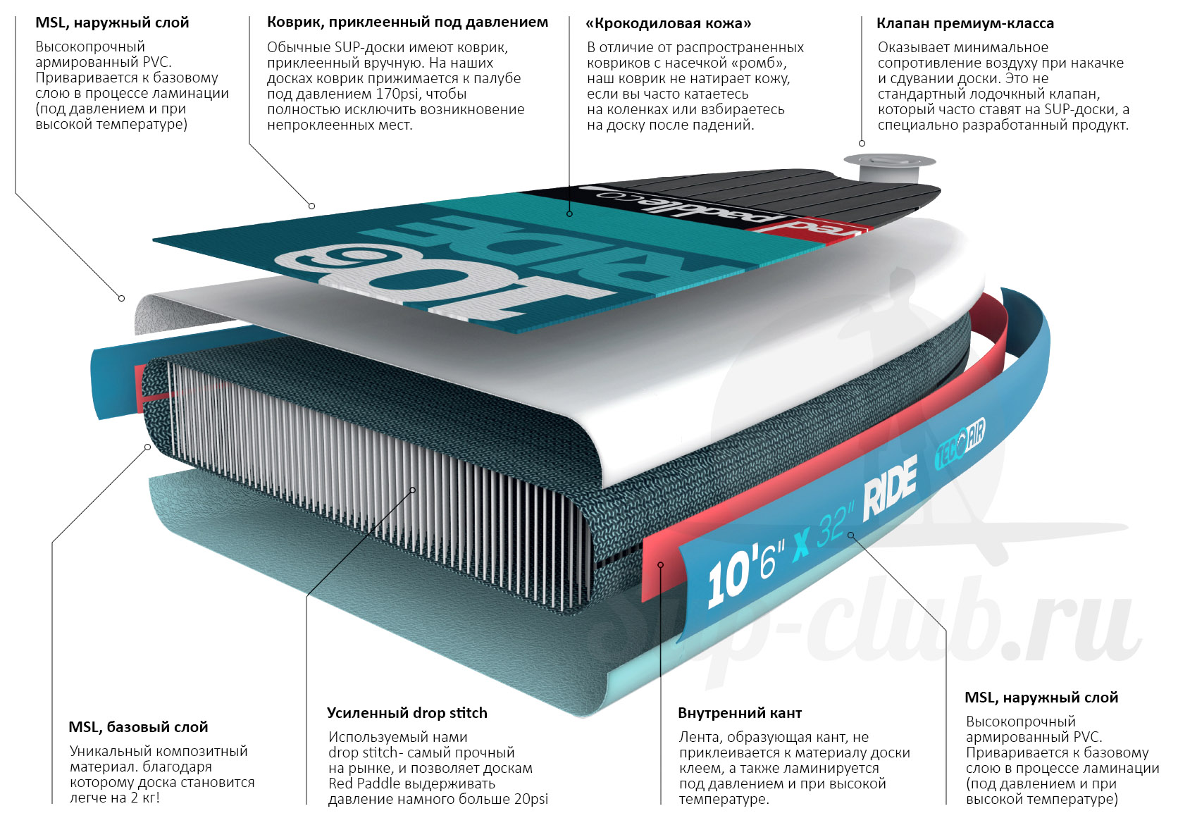 Доска получается ровной, гладкой на ощупь, а при накачке под давлением оказываются оба слоя, а не один. За счет этого существенно увеличивается торсионная жесткость.