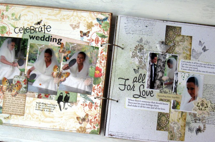 Ничто не сможет так украсить и обогатить ваш свадебный альбом как скрапбукинг. Техника скрапбукинга позволяет совместить фотографии с разнообразными аксессуарами — открытками, письмами, вырезками, рисунками, аппликациями. Предполагает использование различного декора, ткани, цветов, украшений, объемных фигурок.