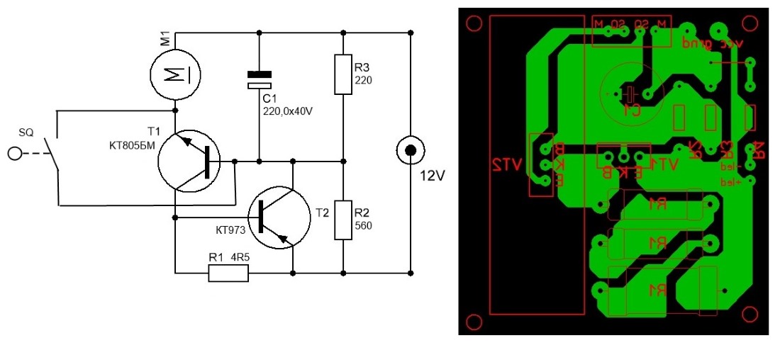 Схема автоматического регулятора оборотов в зависимости от нагрузки для двигателя на 12 В (нажмите для увеличения)