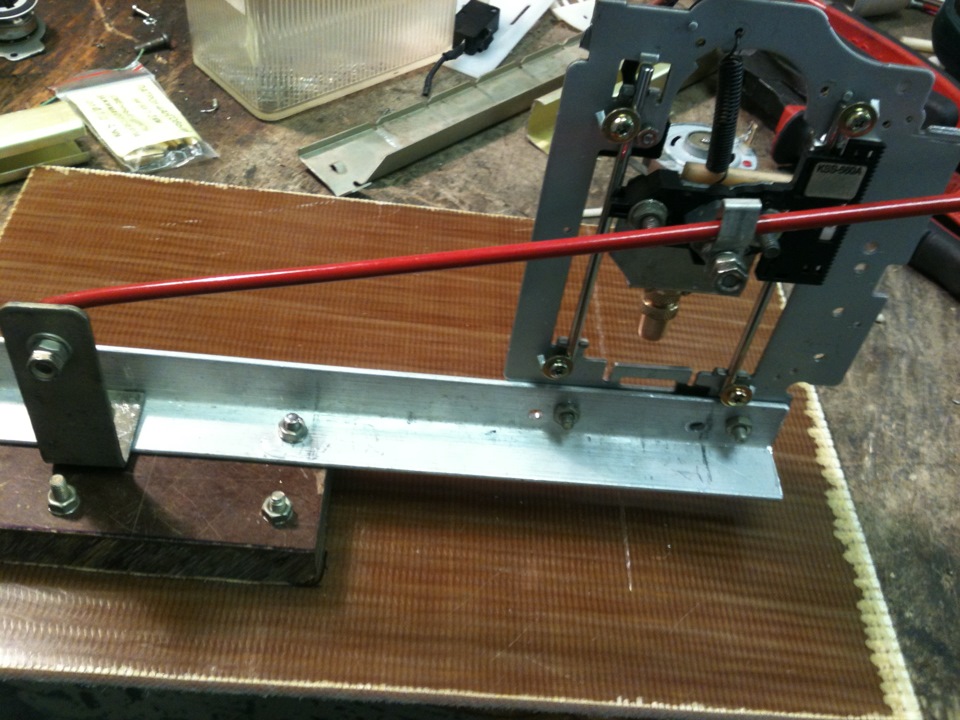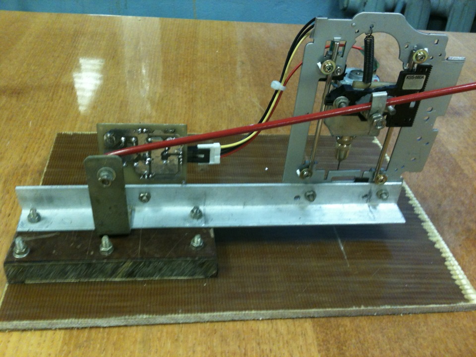 Кинематику взял с двигающимся двигателем. Каламбур получился)) В общем, двигатель с патроном опускается. За основу этого узла взяты салазки и каретка “глаза” CD-ROM или любого иного привода. На ней смонтировал двигатель, подпружинил к раме, приделал рычаг для опускания, всю эту конструкцию закрепил на алюминиевом уголке, его в свою очередь через проставку к основанию из плиты стеклотекстолита. Фото всей конструкции ниже.