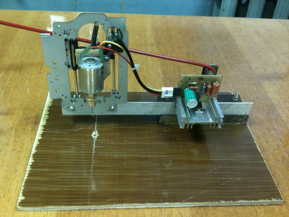 Кинематику взял с двигающимся двигателем. Каламбур получился)) В общем, двигатель с патроном опускается.За основу этого узла взяты салазки и каретка “глаза” CD-ROM или любого иного привода. На ней смонтировал двигатель, подпружинил к раме, приделал рычаг для опускания, всю эту конструкцию закрепил на алюминиевом уголке, его в свою очередь через проставку к основанию из плиты стеклотекстолита.Фото всей конструкции ниже.