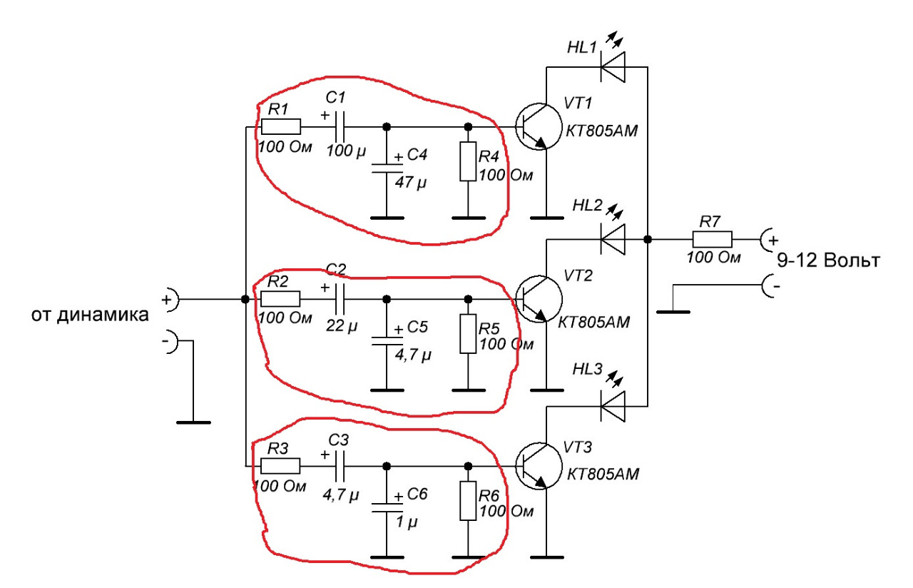 Заметьте, не все светодиоды моргают в такт музыки. Вот желтый, например, начинает загораться только тогда, когда в песне появляются басы или, по-научному, низкие частоты. В чем же дело? А дело в том, что схема по сути состоит из трех фильтров. Один фильтр пропускает низкие частоты, другой фильтр пропускает только средние частоты, третий – высокие частоты. Каждый фильтр я пометил в красной области