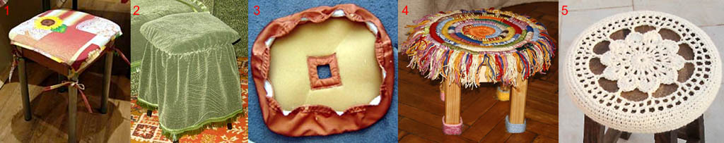 Наконец, вязаная накидка, поз. 5. Это вариант трудоемкий и почти исключительно декоративный. Он позволяет добиться великолепного зрительного эффекта, но, увы, вязаная накидка долго сохранит свой вид только на табурете, на котором не сидят.