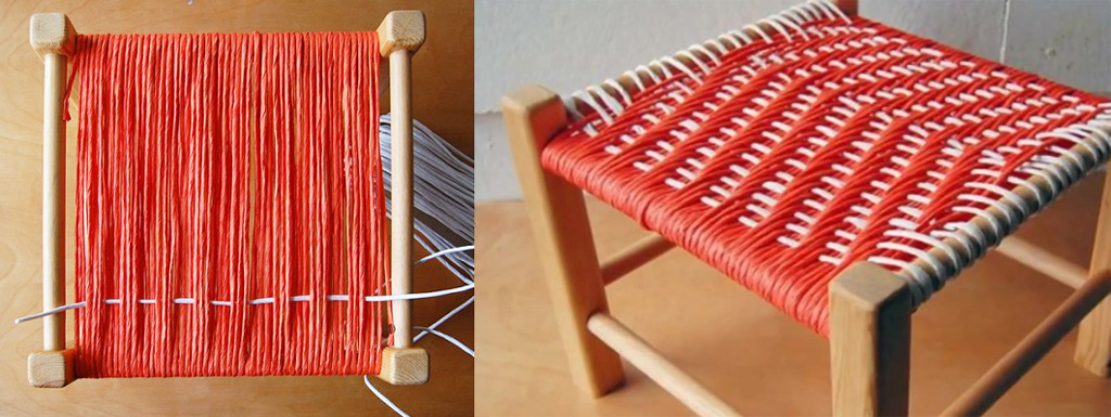 Долго сидеть на жестком, понятное дело, неприятно. Удобный табурет на каркасе классического кухонного можно сделать с плетеным сиденьем, не морочась с сухарями, шкантами и щитом, см. рис. Материал сиденья – цветной пропиленовый шпагат и гладкий бельевой шнур.