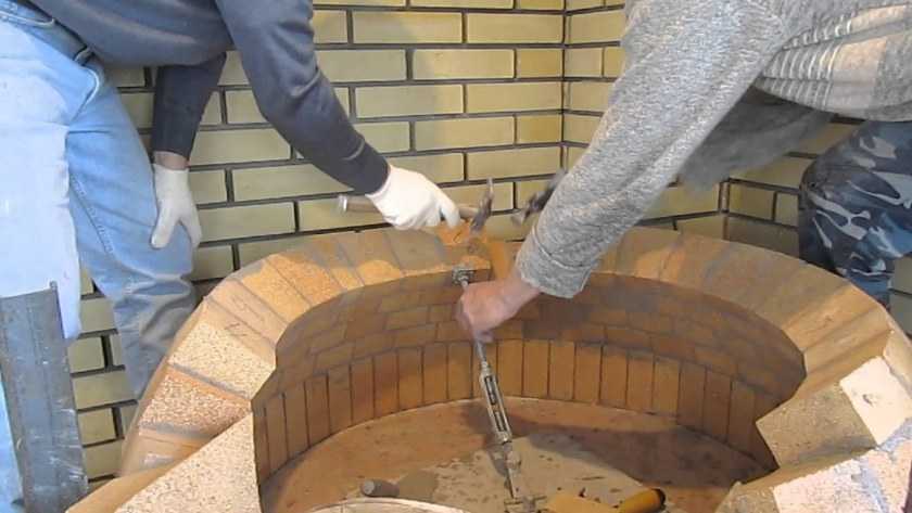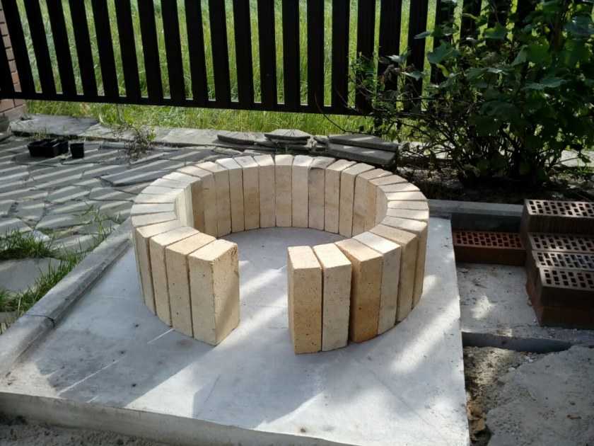 Основное сырье ‒ шамотный кирпич. При необходимости подгонки размеров его режут на части болгаркой. Чтобы не ошибиться при кладке, рекомендуется сделать шаблон.