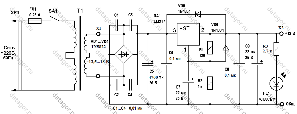 Рис. 12. Блок питания на микросхеме регулируемого стабилизатора LM317
