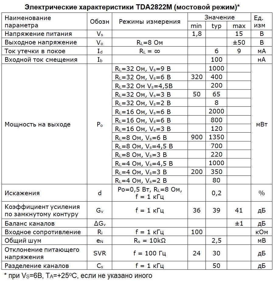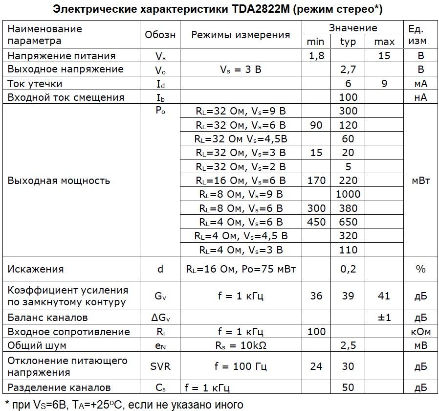 Рассмотрим электрические характеристики TDA2822M из datasheet (на русском языке). Производители приводя их в отдельных таблицах для разных схем включения. Номинальное напряжение питания (VS) 6 В, если не указано иного. Температура устройства не должна превышать +25°C. Дополнительные режимы измерений указаны в отдельном столбце. Вот параметры при работе в режиме стерео.